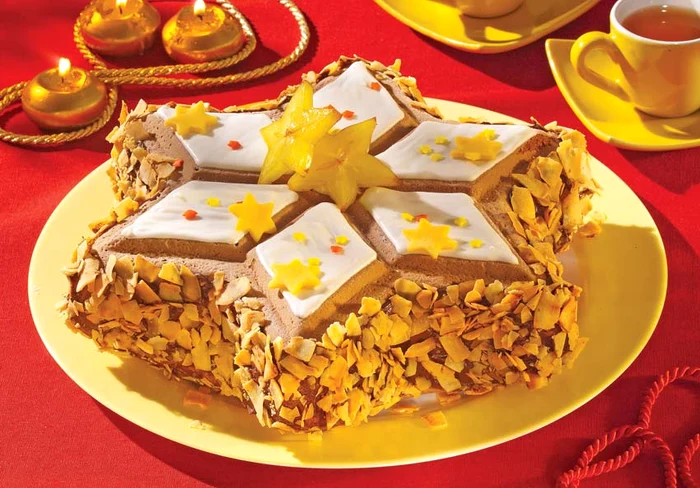 - Îmbraci marginile cu restul de cremă, cu fulgi de migdale copţi şi-l decorezi cu pastă de zahăr şi, dacă vrei, cu feliuţe de fruct stea. Îl dai la frigider peste noapte.