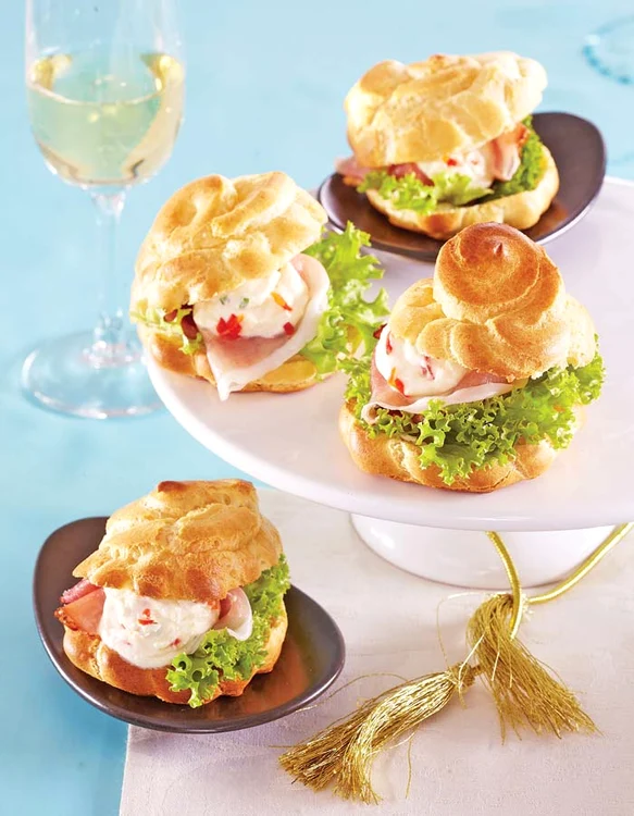 - Pentru umplutură, tai ceapa verde şi ardeiul şi le amesteci cu crema de brânză. Umpli choux-urile cu bucăţi de salată verde, pastramă de porc şi cu cremă de brânză.