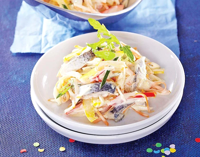 Ingrediente: 300 g scrumbie marinată, 1 ceapă, 1 ardei galben, 1 morcov, 1 ţelină mică, 2 linguri maioneză, 100 g iaurt, 1 lingură zeamă de lămâie.