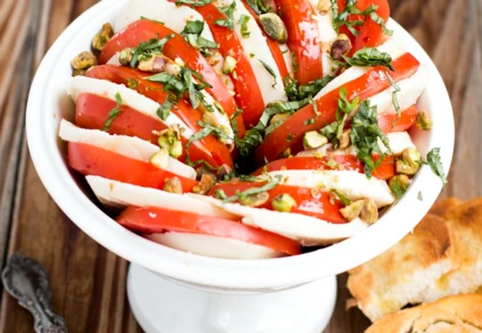 3 roşii mari450 g mozzarella1/3 cană fistic mărunţit2 linguri busuioc, tocatulei de măslineoţet balsamicsarepiper