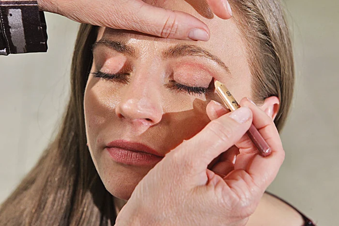 Specialista a ales un creion dermatograf maro închis şi altul pentru conturul buzelor într-o nuanţă de roz-piersicuţă. Cu cel maro s-a trasat conturul ochilor, la baza genelor, apoi s-a difuzat uşor cu degetele, dinspre exterior spre interior. Cel deschis s-a pus pe pleoapă, apoi s-a şters de asemenea cu degetul de sus în jos şi dinspre exterior spre interior. „Mixul dintre cele două nuanţe va da ca rezultat o umbră naturală, în degrade. Mai aplicăm puţin creion maro la baza genelor superioare şi inferioare şi, iată, într-un minut machiajul ochilor e gata”, spune Florina Mărcuţă.