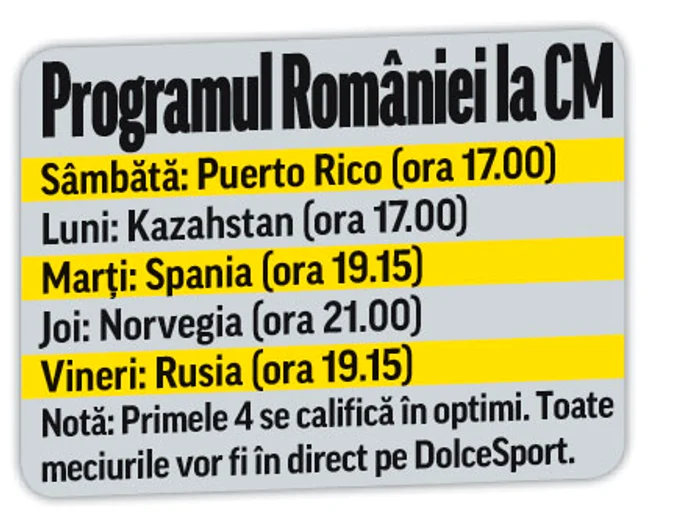 Speranţele noastre la Mondialele la care vom debuta azi se leagă de prestaţia liderului echipei, Cristina Neagu. Cea mai valoroasă jucătoare a Ligii Campionilor, acolo unde evoluează pentru Buducnost, Cristina a ajuns la vârsta deplinei maturităţi handbalistice: 27 de ani. O vârstă la care bifează al optulea turneul final de Mondial sau European. Cum o singură dată a obţinut o medalie – în 2010, bronz la Europene – Neagu are şi o revanşă personală de luat. De aceea, s-a pregătit special pentru această competiţie, iar evoluţiile din amicale arată că se apropie de forma maximă. Joi, în ultimul amical de dinaintea începerii Campionatului Mondial, româncele au învins cu scorul de 33-30 Suedia, în deplasare, Neagu fiind cea mai bună jucătoare de pe teren, marcatoare a 8 goluri. România va debuta la Mondialele din Danemarca azi, de la ora 17.00, contra formaţiei statului Puerto Rico. Apoi, va juca, în ordine, împotriva Kazahstanului, Spaniei, Norvegiei şi Rusiei. Toate meciurile vor fi în direct pe DolceSport, primele patru clasate calificându-se în optimile de finală.