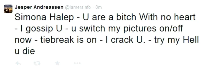 Succesele excepţionale obţinute în ultimii doi ani de Simona Halep i-au atras o mulţime de fani din toată lumea. Numai că unii dintre ei sunt şi periculoşi! În ultimele zile, pe contul oficial de Twitter al Simonei Halep au apărut mai multe mesaje ameninţătoare din partea unui fan danez, Jesper Andreassen. Acesta, supărat după ce ar fi aflat că Simona s-ar mărita în curând – lucru total neadevărat – a început să-i trimită mesaje de ameninţare cu moartea! „Simona Halep - Eşti o târfă fără inimă (...) Suntem la tiebreak - Te distrug - Încearcă iadul meu, vei muri!”, au fost unele dintre mesajele trimise de Jesper Andreassen pe contul său de Twitter.