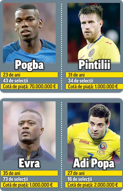 Cu duelul Pogba – Pintilii fără un câştigător net, putem spera să ducem mingea în jumătatea franceză şi, de ce nu, să ne lipim la cel puţin un gol. Mulţi vorbesc despre fragilitatea „cocoşilor” în zona stoperilor, însă veriga slabă a naţionalei franceze ar putea fi fundaşul stânga Evra. Ajuns la 35 de ani, el nu mai aleargă ca în prima tinereţe şi poate fi depăşit în viteză de „Motoreta” Adi Popa. Jucătorul de bandă al Stelei ar fi o armă secretă pentru noi, ţinând cont de faptul că francezii îşi vor lua măsuri suplimentare de precauţie la Stanciu. De altfel, duelul Popa – Evra ar fi singurul în care reprezentantul nostru are o valoare de piaţă superioară.