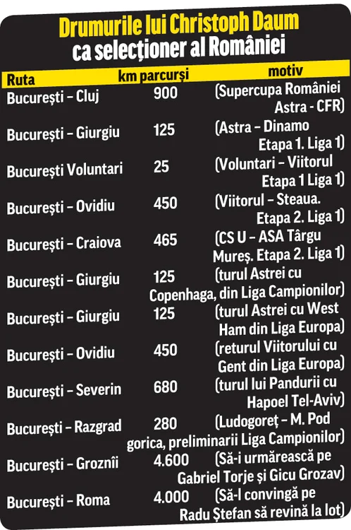 Periplul său nu s-a rezumat însă nici pe departe la atât. Au venit meciurile românilor din preliminariile cupelor europene, iar Christoph Daum le-a văzut pe toate de pe teren propriu. Astfel, neamţul a parcurs un total de 250 de kilometri. Apoi, a străbătut dus şi întors 680 de kilometri până la Severin pentru dezastrul gorjenilor cu Hapoel Tel-Aviv şi alţi 450 până la Ovidiu şi înapoi pentru returul Viitorului cu Gent. În plus, Daum a văzut şi majoritatea meciurilor mari disputate de Steaua pe Arena Naţională, cu Dinamo, Sparta Praga şi Manchester City.