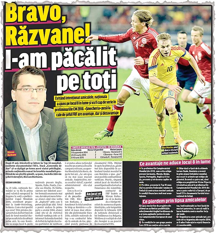Pentru prima dată după Euro 2004, România va fi plasată în urna capilor de serie. Pentru Mondialul din 2018, FIFA a luat în calcul doar rezultatele din ultimii patru ani (iulie 2011 – iulie 2015), care au dus România pe un incredibil loc 8 în lume. Tricolorii au beneficiat astfel de grupa extrem de lejeră din preliminariile Euro 2016, dar şi de o găselniţă a Federaţiei. Informaţi de faptul că meciurile amicale pot trage în jos punctajul României în clasamentul FIFA, oficialii FRF-ului au evitat în ultimul an partidele de verificare.