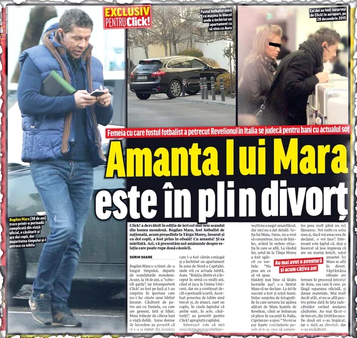 Click! a dezvăluit cu lux de amănunte cum Bogdan Mara trăia o viaţă dublă. Nimeni nu s-ar fi aşteptat ca el, un fost fotbalist care n-a fost implicat niciodată în scandaluri, să fie protagonistul unui asemenea scenariu. Mara se mutase de ceva vreme de acasă, locuia cu amanta într-un apartament închiriat şi şi-a dorit, o perioadă, să păstreze aparenţele. Aşa se face că a petrecut Crăciunul cu soţia şi micuţii la munte, apoi, de Revelion, şi-a dus amanta în vacanţă, în Italia.