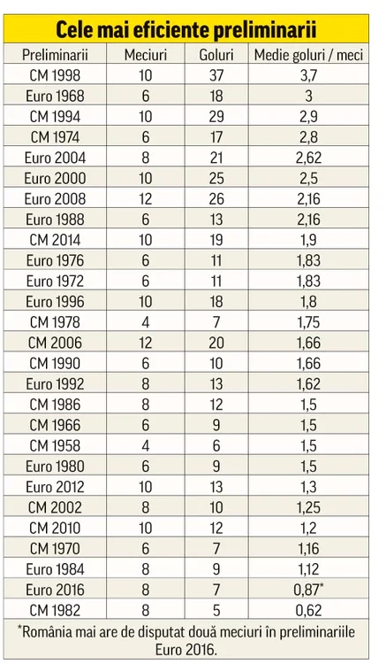 În cea mai uşoară grupă din istorie, naţionala lui „Tata Puiu” a dat şapte goluri în opt meciuri. De-a lungul timpului, România a mai avut o singură dată o medie de sub un gol pe meci în preliminarii. Se întâmpla în urmă cu 34 de ani, cu Anghel Iordănescu jucător.