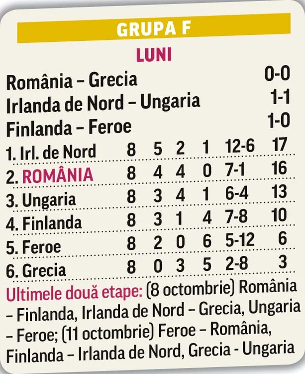 Cel mai probabil, România va putea obţine accesul matematic la Euro abia după ultimul meci din grupă, cel de la 11 octombrie de la Torshavn.De ce ne-a fost frică n-am scăpat! În proporţie de peste 90 la sută, vom tremura din nou pentru calificarea la un turneu final până la ultimul minut al ultimului meci din preliminarii. Pornind de la premiza că Ungaria se va impune la 8 octombrie, acasă, contra Insulelor Feroe, tricolorii lui Anghel Iordănescu n-au cum să se bucure înainte de 11 octombrie, atunci când e programată ultima rundă a Grupei F. Până atunci, România mai are însă de dat un examen, contra Finlandei pe teren propriu, meci care se anunţă destul de complicat. După ultimele rezultate, finlandezii se agaţă de o miraculoasă clasare pe poziţia a treia, motiv pentru care îşi vor vinde scump pielea la Bucureşti. În concluzie, pentru a nu depinde de celelalte rezultate ale grupei, România are nevoie de cel puţin patru puncte în disputele cu Finlanda şi Feroe. Orice eşec se poate dovedi fatal, în condiţiile în care ungurii şi nord-irlandezii îşi vor câştiga cele două partide rămase de disputat. Aceasta pentru că, deşi avem trei puncte peste naţionala Ungariei, maghiarii ne vor lua faţa la egalitate de puncte ca urmare a meciurilor directe (1-1 la Bucureşti şi 0-0 la Budapesta).