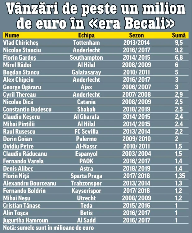 Recordul de transfer îl deţine Chiricheş, care a fost dat la Tottenham în sezonul 2013/ 2014 pentru 9,5 milioane de euro. E urmat de Stanciu, cedat la Anderlecht în urmă cu doi ani şi jumătate pentru 9,2 milioane de euro. Pe locul 3 în clasament este Gardoş, pe care l-a transferat la Southampton în 2014/ 2015 în schimbul sumei de 6,8 milioane de euro. În rest, doar Rădoi, vândut la Al-Hilal în 2009 pentru 6 milioane de euro, într-o perioadă în care antrenor era Cosmin Olăroiu, a mai trecut de graniţa celor 5 milioane. Adică atât cât i-a costat pe cei de la Galatasaray transferul lui Bogdan Stancu, în 2011. Dacă mergem şi mai departe cu cercetarea, vedem că Gigi Becali nu a reuşit să vândă decât 25 de jucători cu sume de cel puţin un milion de euro, bani despre care acum afaceristul spune că nici nu s-ar atinge dacă i i-ar oferi cineva.