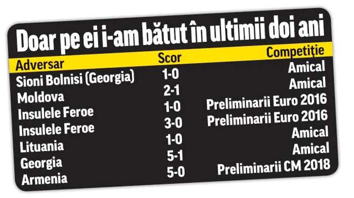 Am fost la Euro 2016, avem pretenţii să mergem şi la Mondialul din 2018, dar noi nu batem pe nimeni de o bună bucată de vreme. Practic, dacă nu câştigă astăzi amicalul cu Rusia de la Groznîi, tricolorii vor completa doi ani de coşmar, în care le-au lipsit cu desăvârşire victoriile cu greutate. Asta pentru că „marile” succese cu feroezii, moldovenii, georgienii, armenii şi lituanienii ne lasă rece, indiferent de contextul în care au fost realizate. La 18 noiembrie 2014, România învingea Danemarca (2-0) într-un amical disputat pe Arena Naţională, acesta fiind ultimul meci mare făcut de echipa noastră. De la acea partidă decisă de dubla lui Claudiu Keşeru a urmat un lung şir de dezamăgiri în partidele cu naţionale puternice. Remizele amicale cu Italia (2-2) şi Spania (0-0) nu salvează deloc onoarea tricolorilor, de vreme ce la Euro 2016 am dezamăgit cumplit, iar campania de calificare la Mondialul de peste doi ani a început la fel de prost.
