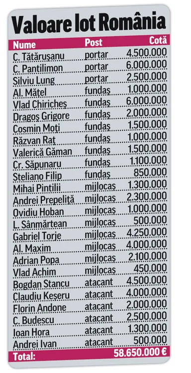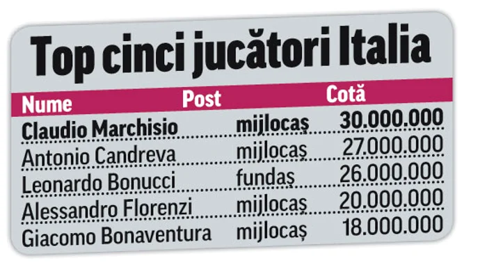 Fundaşul Pandurilor ştia că Juve “oferă” fotbalişti şi la echipa naţională, iar unul dintre ei, Claudio Marchisio, este şi cel mai scump din toată echipa. Ca o comparaţie: mijlocaşul de 29 de ani costă 30 de milioane de euro, iar toată echipa noastră e însumată la 58.650.000 de euro, adică banii pentru un singur adversar pot cumpăra mai bine de jumătate din lotul “tricolorilor”.