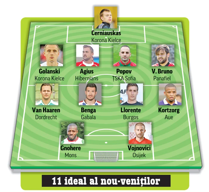 Luând-o pe posturi, cel mai răsunător nume de portar venit în campionatul nostru este cel al polonezului Cerniauskas. Toată lumea îl ştie pe acesta din perioada lui la Vaslui, 2010-2014, cea mai importantă din istoria moldovenilor, iar transferul său la Dinamo este de fapt o revenire. Celălalt portar ajuns pe plaiurile mioritice este bulgarul Plamen Iliev, transferat de FC Botoşani de la Levski Sofia. La capitolul fundaşi bifăm de asemenea un prim nume cunoscut şi revenit după câţiva ani de pauză: polonezul Pavel Golanski. Fostul stelist a ajuns la Târgu Mureş de la Korona Kielce, dar a nimerit în ditamai haosul. Apoi, trecem la cea mai exotică venire din acest sezon, fundaşul central Andre Agius. Acesta este primul maltez din Liga I şi a fost transferat de CSMS Iaşi de la Hibernians, din campionatul lor intern. CS U Craiova oferă un singur transfer în această pauză, bulgarul Popov, venit gratis de la falimentara ŢSKA Sofia. Pe postul de fundaş stânga în cea mai bună echipă a noilor transferaţi în Liga I este portughezul Vitor Bruno, pe care CFR Cluj l-a adus de la Panafiel. La mijlocul terenului vedem un jucător român de care nu mai auzisem de ceva vreme, Alexandru Benga. Mijlocaşul central a plecat de la Petrolul în ianuarie 2014 la Potev Plovdiv, unde a jucat şase luni, iar după un an în Azerbaidjan a revenit la Ploieşti. Apoi, Dinamo a transferat şi ea un jucător din Olanda, Van Haaren, dar de la o echipă retrogradată în Liga a II-a. Din Spania ne vine Fernando Llorente, dar nu cel veritabil, legitimat la Juventus, ci o sosie a sa de la Burgos, transferată gratis de ACS Poli Timişoara. Nu în ultimul rând, Romario Kortzorg, mijlocaş stânga, a venit din liga a doua germană să se bată pentru Liga Europa cu ASA Târgu Mureş. În atac, petrolistul Gnohere, adus de la belgienii de la Mons, şi croatul Vojnovic, venit la Dinamo de la Osjek, promit să facă furori. Antrenorul acestei armate de mercenari nu poate fi decât Mirel Rădoi, revenit în ţară după şase ani la arabi.