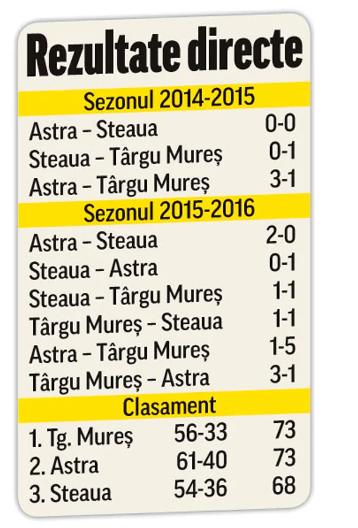 În 2015, Steaua, Astra şi ASA Târgu Mureş s-au întâlnit între ele o dată în primăvară şi de două ori în această toamnă (datorită schimbării sistemului competiţional). Luând în calcul doar rezultatele din meciurile directe, clasamentul în trei e condus tot de ASA Târgu Mureş, cu 11 puncte, faţă de cele 10 ale Astrei. În schimb, Steaua n-a reuşit decât trei remize cu pricipalele rivale din Liga I.