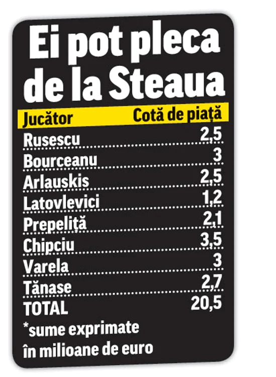 Fără cei cinci menţionaţi mai sus, Steaua va avea nevoie de timp pentru a se reinventa, în ciuda transferurilor pe bandă rulantă promise de Gigi Becali. Mai mult, Mirel Rădoi s-ar putea trezi în orice moment cu alte trei dezertări din lot. Este vorba despre jucătorii cu cea mai bună cotă de piaţă (Chipciu, Varela şi Tănase), toţi trei fiind declaraţi transferabili.