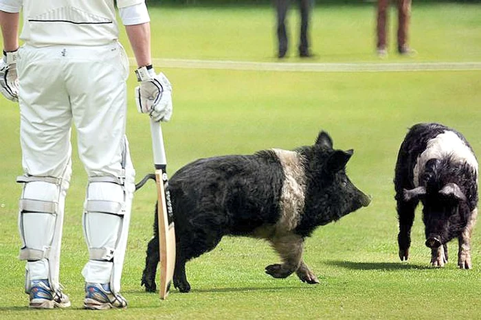 Deşi pare greu de crezut, chiar şi porcii pot ajunge în locurile de desfăşurare ale competiţiilor sportive. Un astfel de eveniment s-a petrecut la un meci de cricket desfăşurat în Anglia, la Cheshire, întâlnirea fiind întreruptă de vizita neanunţată a doi porci mistreţi.