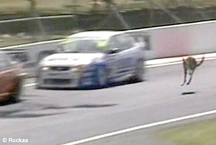 În Ţara Cangurilor (Australia), te poţi întâlni peste tot cu simpaticele animale. Un astfel de exemplar şi-a permis să sară pe pista unde avea loc o cursă de maşini. Din fericire, cangurul a scăpat nevătămat, deşi a ţopăit printre bolizii care rulau cu viteze ameţitoare.
