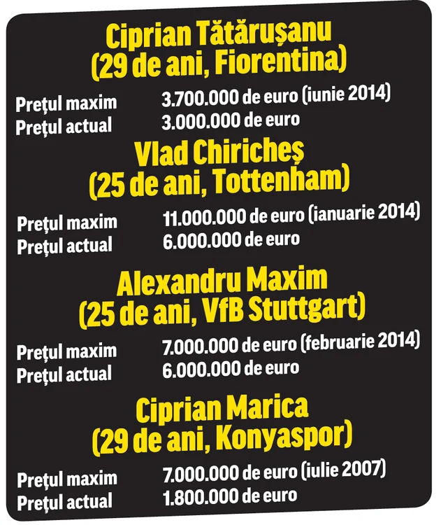 Ce onoare pentru România să fie în Top 10 mondial peste reprezentative precum cele ale Spaniei, Angliei, Franţei şi Italiei! Acum suntem pe locul opt, dar luna viitoare vom mai avansa o poziţie, până pe şapte, în ierarhia făcută de FIFA ţinând cont de rezultatele din ultimii patru ani (2011-2015). Orice străin care priveşte aceste date şi-ar imagina că fotbaliştii români au explodat şi sunt la mare căutare prin Europa. După cum bine ştim, nu este deloc aşa, ba din contră jucătorii noştri au luat-o rău la vale în ceea ce priveşte aprecierea pe piaţa transferurilor.Cea mai bună dovadă în acest sens ne este oferită de site-ul transfermarkt.de, specializat pe aprecierea financiară a fotbaliştilor din întreaga lume. Astfel, analizând cât valorează în prezent principalii jucători din naţionala României, ajungem la o concluzie îngrijorătoare. Mai exact, axul central al tricolorilor, format din portarul Tătăruşanu, fundaşul Chiricheş, mijlocaşul Maxim şi atacantul Marica se duc în jos în ceea ce priveşte cota de piaţă. Toţi cei patru menţionaţi mai sus ar putea fi titulari la Euro 2016 sau chiar la CM din 2018, dar nici măcar unul nu e într-o postură favorabilă la echipele de club.Cele mai abrupte căderi sunt resimţite de Ciprian Marica şi Vlad Chiricheş. Primul plăteşte tribut faptului că a „retrogradat” din Bundesliga în campionatul Turciei, în timp ce fostul stelist a pierdut la Tottenham nu mai puţin de cinci milioane de euro în decurs de un an şi jumătate.Deşi evoluează în Germania şi e curtat de mai multe echipe, Alex Maxim simte şi el un uşor recul, semn că prestaţiile sale nu sunt atât de apreciate. În ceea ce-l priveşte pe Tătăruşanu, transferul la Fiorentina ar fi trebuit să fie un pas înainte. Totuşi, din cauza faptului că „Tătă” n-a fost un titular constant la gruparea „viola”, cota fostului stelist a scăzut.Este de aşteptat, însă, ca valoarea jucătorilor noştri să crească dacă echipa naţionala se va califica la turneul final al Campionatului European din 2016. Formaţia antrenată de Anghel Iordănescu este foarte aproape de realizarea acestui obiectiv, toamna fiind, însă, decisivă pentru obţinerea biletelor la o competiţie la care nu am mai fost prezenţi din 2008.