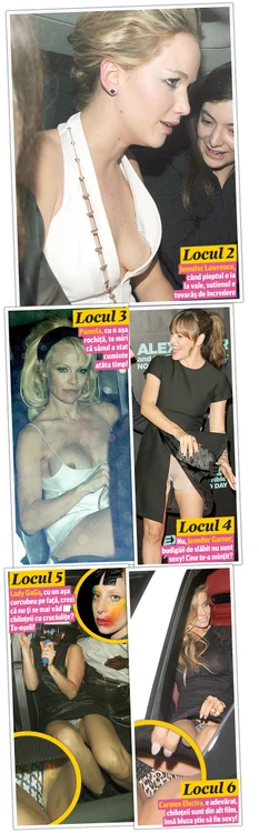 Paris Hilton a început anul 2014 cu stângul. A vrut să-şi serbeze împlinirea celor 33 de ani într-o rochie roz, fără chiloţei pe ea şi a făcut-o de oaie. Fotografii au pus-o să pozeze sexy şi, ups! Paris şi-a dezvelit ruşinica, imperfect coafată. Nici pentru Jennifer Lawrence 2014 nu a fost un an liniştit. În noiembrie, un sân i-a ieşit pe afară şi criticii au şi înţepat-o spunându-i că „i s-a cam pleoştit decolteul”.