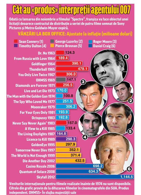 De 52 de ani, agentul 007 face legea în cinematografie. James Bond este cel mai de succes agent din toate timpurile şi cele 24 de filme care îl au ca erou au fost pe primele locuri în preferinţele iubitorilor de cinema.