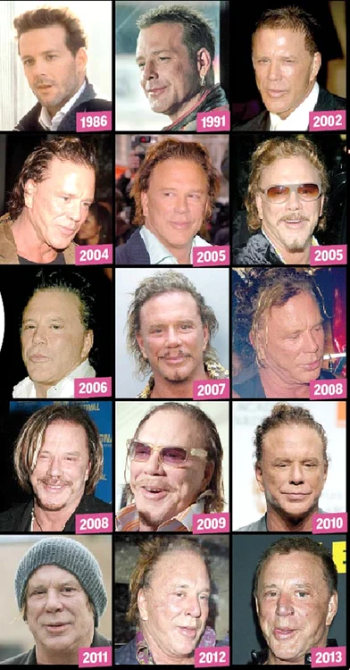 După trei ani de antrenamente şi renunţarea la botox şi operaţii, starul a reuşit să slăbească 15 kilograme şi să-şi recapete, în mică parte, trăsăturile care au fascinat femeile de pe întreaga planetă, pe când a jucat în filmul “9 săptămâni jumătate”, în 1986. Actorul, cu o avere de 15 milioane de dolari, a făcut eforturi să-şi recâştige înfăţişarea atletică pentru a juca în rolul rugbistului Gareth Thomas într-un nou film. Însă apropiaţii spun că Rourke şi-a dat toată silinţa să recapete faţa plăcută de odinioară şi pentru tânăra lui iubită, rusoaica Anastassija Makarenko, de 27 de ani. Starul a început să-şi tot schimbe feţele după ce, în 1991, când cariera sa cinematografică intrase în declin, s-a apucat de box profesionist. Nasul fracturat de două ori a necesitat vreo şase intervenţii chirurgicale. I s-a luat cartilaj de la ureche ca să i-l remodeleze. Băiatul rău al anilor ‘90 s-a ales şi cu un pomete spart şi a trebuit să-i fie reconstruit. A devenit apoi dependent de botox şi, până acum 3 ani, pentru orice rol, îşi modifica faţa cu bisturiul. Nici el însuşi nu mai ţine minte numărul operaţiilor estetice suferite.