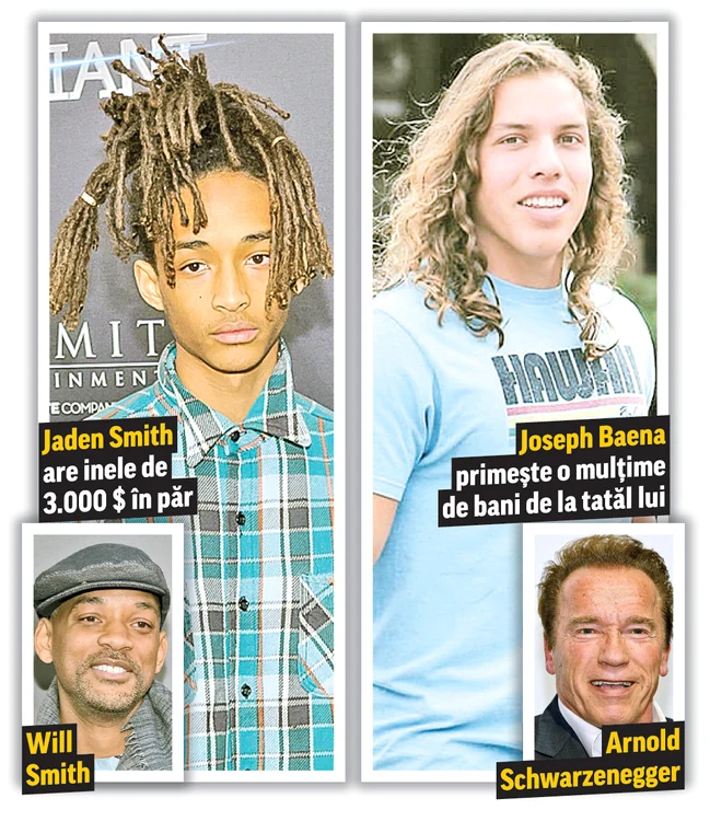Jaden Smith, de 17 ani, este fiul fiţos al actorilor Will Smith (47 de ani) şi Jada Pinkett Smith (44 de ani). A fost mereu răsfăţat de părinţii lui, care au o avere de 280 de milioane $. Nu îi refuză nimic, aşa că nu este de mirare că băiatul poartă în păr inele de 5.000 $ (circa 19.700 de lei). Pe mână poartă trei inele care costă 1.070 $ (4.207 de lei) şi 1.650 $ (6.488 de lei) bucata. Pe mână are un ceas de 3.000 $ (11794 de lei). Joseph Baena (18 ani), fiul din flori al lui Arnold Schwarzenegger (68 de ani), este şi el foarte răsfăţat de tatăl său care are o avere de 300 de milioane $. El primeşte10.000 $ (39.312 de lei) pe lună de la star şi îşi ia doar lucruri scumpe ca să-şi copieze părintele. Mama lui, Mildred Baena (54 de ani), îl pregăteşte să facă cinema ca şi tatăl lui, căruia îi seamănă leit.