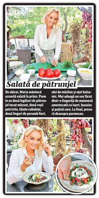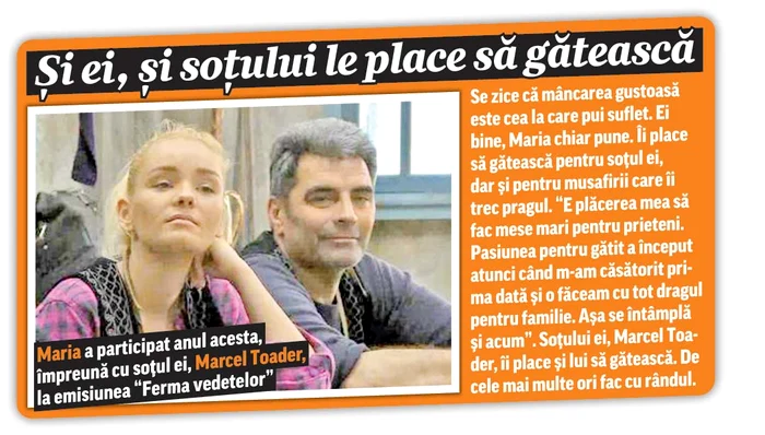 De altfel, tot după participarea la emisiunea de la Pro Tv, unde a prins gustul preparatelor cu năut, mei, linte şi alte legume, Maria s-a hotărât să mănânce mai sănătos. „Înainte aveam un regim alimentar destul de gras. Mergeam la mama la Vâlcea unde grătarul era în floare, mâncam sarmale, pui la cuptor şi multe altele. Vă daţi seama că se alegea praful de dietele mele. Nu am avut probleme cu greutatea până să rămân însărcinată (n.r. Maria are un băieţel în vârstă de şapte ani din prima căsătorie), dar acum trebuie să fiu mai atentă, mai ales că sunt o gurmandă. Sunt înnebunită după crema de ciocolată, după prăjiturile făcute de mine şi după cheesecake-ul făcut de soţul meu”, explică ea.