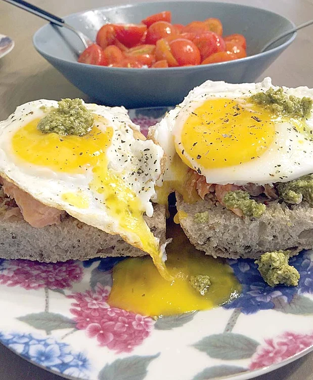 Reţeta lor de Ouă Benedict. Într-o dimineaţă cei doi au încercat o reţetă pe care o savuraseră de câteva ori la o brasserie din oraş – Ouă Benedict. Reţeta e simplă. Au avut nevoie de chifle cu seminţe tăiate pe jumătate, sos pesto, somon la cuptor, ouă în tigaie, muştar şi roşii. Peste chifle se pune sosul pesto, bucăţele de somon, puţin muştar şi câte un ou ochi. Roşiile sunt alături, într-o salată cu ulei de măsline.