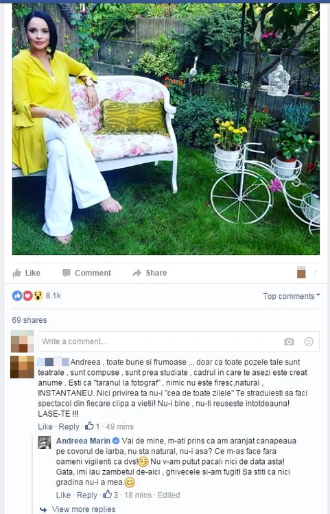 Iar răspunsul „Zânei” a fost unul pe măsură. Vedeta nu s-a putut abține să-i dea o replică plină de sarcasm. „Vai de mine, m-ați prins că am aranjat canapeaua pe covorul de iarbă, nu stă natural, nu-i așa? Ce m-aș face fără oameni vigilenți ca dvs! Nu v-am putut păcăli nici de data asta! Gata, îmi iau zâmbetul de-aici, ghivecele și-am fugit! Să știți că nici grădina nu-i mea”, a scris Andreea Marin, pe profilul personal de pe o rețea socială.
