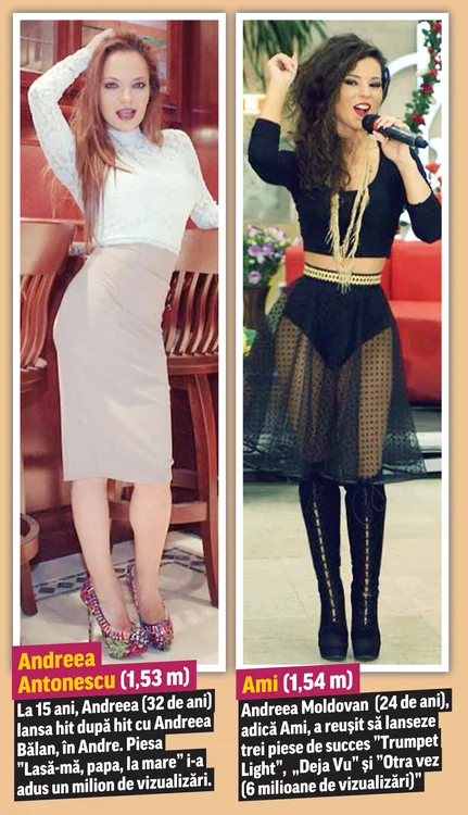 Considerată de unii critici muzicali drept cea mai bună voce feminină a muzicii pop româneşti din ultimii 30 de ani, Mirabela Dauer (67 de ani) a făcut furori pe scena muzicală, iar piesele ei “Fotoliu din odaie” şi “Mulţumesc, iubită mamă!” nu s-au demodat. Artista nu a fost vreo prezenţă impunătoare, măsurând doar 1,62 de metri , însă charisma şi vocea de cinci stele i-au adus succesul. Iar cântăreaţa Carmen Trandafir (40 de ani) este şi mai scundă, simpatica bruneta măsurând doar 1,53 m. La doar 16 ani, solista a obţinut locul 1 la Secţiunea Interpretare, la Festivalul Mamaia, iar câţiva ani mai târziu a ”împuşcat” trofeul la Festivalul Internaţional de Muzică ‘’Orfeul de Aur’’, din Bulgaria.
