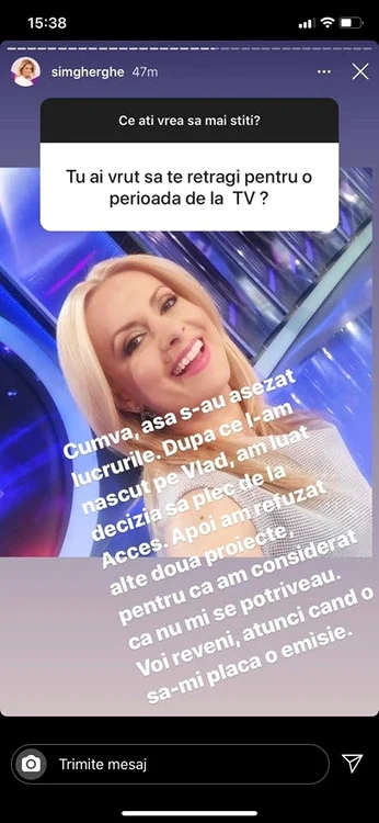 Simona Gherghe a anunțat când și în ce circumstanțe va reveni în fața publicului, pe micul ecran. Fanii au întrebat-o pe fosta prezentatoare de la Acces Direct când va reveni în fața televizorului, iar răspunsul a venit pe pagina de socializare Instagram a vedetei.