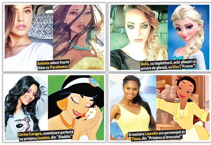 Şi nu doar fetiţele îşi doresc să semene cu personajele principale din aceste poveşti, ci şi celebrităţile autohtone se fălesc că aduc cu superbele prinţese. Site-ul perfecte.ro a realizat o galerie impresionantă cu asemănări între VIP-uri şi personaje Disney, iar Click! a completat cu poze, filme şi vedete noi, cum ar fi Delia (33 de ani), care seamănă izbitor cu regina de gheaţă Elsa, din filmul de animaţie “Frozen”.
