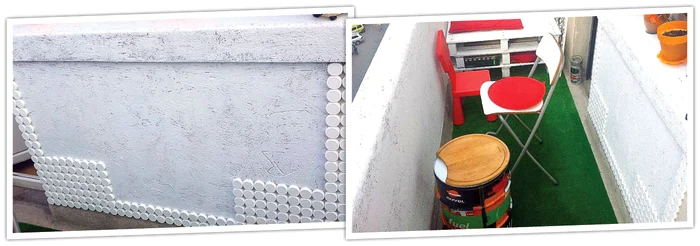Peretele balconului a fost decorat cu dopuri de la cutiile de lapte. Acestea au fost lipite foarte uşor cu pistolul de silicon