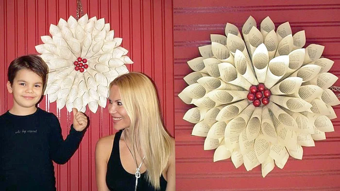 O carte veche, distrusă şi abandonată, a fost transformată într-un frumos medalion pentru perete. Din fiecare pagină s-a făcut câte un cornet, capsat la capăt, apoi acestea au fost prinse între ele cu lipici.