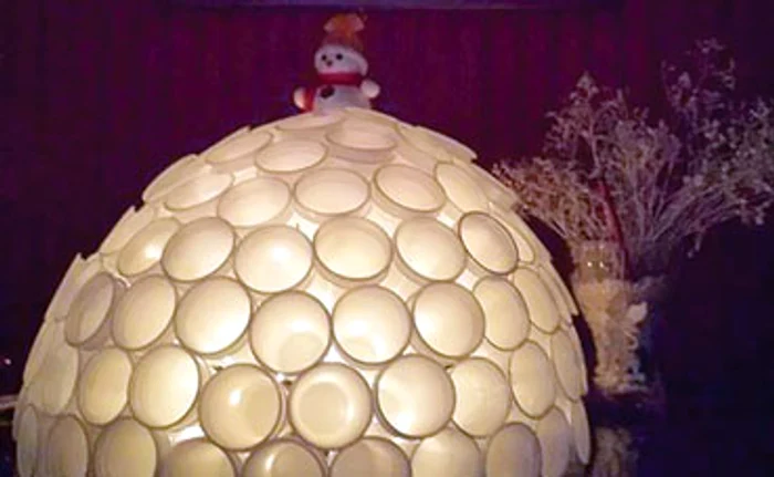 Iată un corp de iluminat din pahare de plastic. Acestea au fost capsate între ele, în jurul unui corp de iluminat (instalaţia de la bradul de Crăciun), şi dublate apoi de alte pahare.