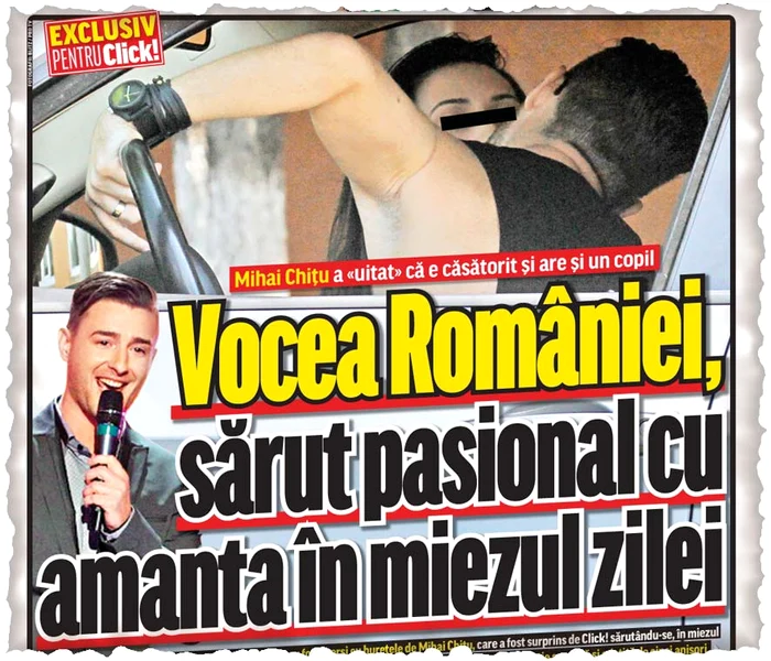 Nici Mihai Chițu (34 de ani), câștigătorul concursului ”Vocea României” (PRO TV), nu a fost cuminte, deși are acasă nevastă și o fetiță. Când i-a fost lumea mai dragă, în timpul unei ședine de sărutri pătimașe cu o brunetă, în BMW-ul familiei, fotoreporterii Click! au apăsat pe butonul aparatului foto. Instantaneele i-au adus din partea Ioanei, nevastă-sa, o săpuneală de cinste, dar nu și divorțul.