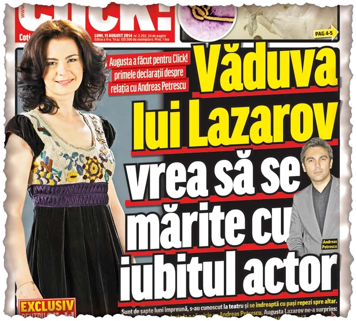 Augusta Lazarov a vrut să-şi ţină ascuns iubitul, pe actorul Andreas Petrescu, ambii în vârstă de 38 de ani, însă ştirea că formează un cuplu am publicat-o, pe 7 august, în premieră. N-au dezminţit ci, dimpotrivă, au decis să ne vorbească despre povestea lor de dragoste, care s-a înfiripat la piesa de teatru ”Mă mut la mama”. Cei doi sunt acum părinţii unui băieţel.