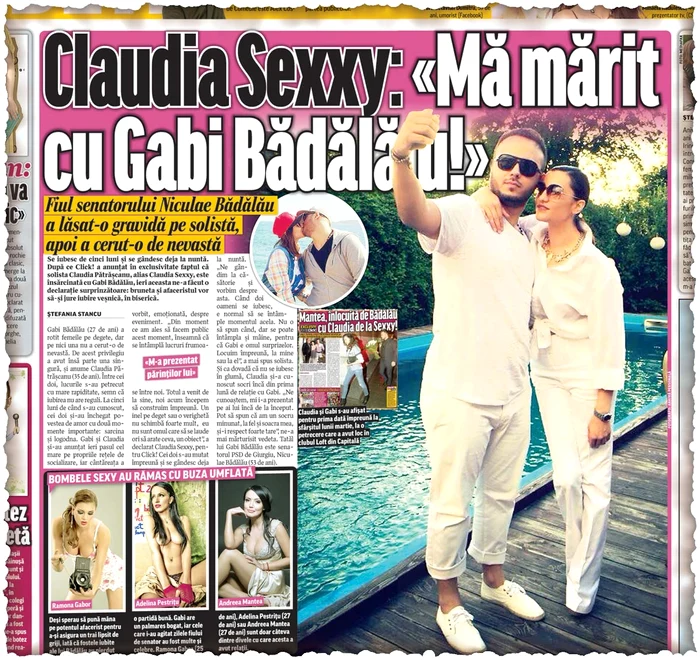 Pe 13 martie, o altă ştire bomba apărea în paginile cotidianului nostru: Gabi Bădălău (26 de ani) se iubeşte cu Claudia Păstrăşcanu, solista trupei Sexxy! Fotoreporterii Click! le-au tăiat calea celor doi îndrăgostiţi la ziua Denisei Nechifor. Când au sesizat că sunt luaţi în vizor, solista a sărit ca arsă, mustrându-l pe Bădălău: “Unde m-ai adus?! E toată presa aici!” Prinsă-n fapt, Claudia a recunoscut că se iubeşte cu Gabi. “Da, avem o relaţie şi suntem împreună de două luni”. Cei doi au devenit, luna trecuta, părinţii unui băieţel.