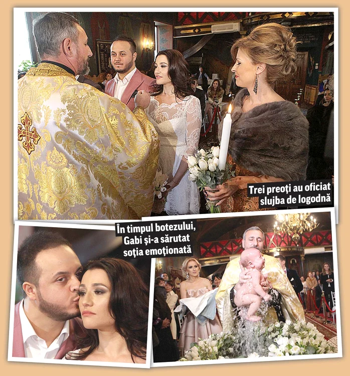 Trei preoţi au ţinut slujba de logodnă, după care a urmat botezul copilului lor, Gabriel Alexandru. Cristelniţa a fost decorată numai cu trandafiri albi, iar momentul în care cel mic a fost scufundat în apă a emoţionat-o foarte tare pe Claudia, căreia i-au curs lacrimile din ochi şiroaie. Gabi, în schimb, a fost cel puternic, susţinând-o de după umeri şi urmărind momentul ca un tătic grijuliu.