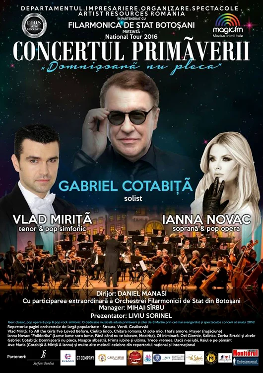 Au mai rămas doar patru zile până la cel mai important eveniment din Botoşani, de pe 4 martie. Este vorba despre concertul intitulat ”Domnişoară, nu pleca”, care va avea loc vineri, la Casa Sindicatelor, în colaborare cu Filarmonica de Stat. Gabriel Cotabiţă (60 de ani), cap de afiş, este în febra emoţiilor în ceea ce priveşte reîntâlnirea cu publicul. Pentru acest spectacol unde majoritare vor fi doamnele şi domnişoarele, el s-a pregătit, din “glas până-n picioare”. Face vocalize zilnic, Adina Buzatu i-a pregătit un costum elegant, însă surpriza ţinutei este încălţămintea, realizată de cel mai tare pantofar din Bucureşti, care lucrează cu materiale rare.