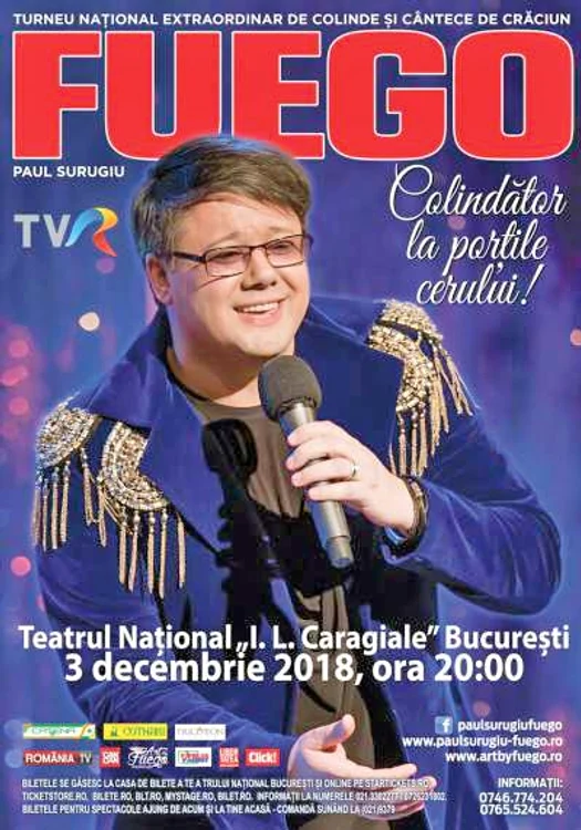 Paul Surugiu-Fuego (42 ani) a împlinit 25 de ani de când s-a lansat la Festivalul de la Mamaia. Iarna aceasta, artistul pornește la colindat pe 3 decembrie, când va susține un concert la Teatrul Național din București, intitulat “Colindător la Porțile Cerului”. Artistul este aşteptat şi la Târgu-Jiu, Craiova, Lipova, Arad, Oradea, Timişoara, Satu Mare, Cluj, Braşov, Râmnicu-Sărat, Buzău, Ploieşti, Curtea de Argeş, Piteşti, Călăraşi, Constanţa, Tulcea, Galaţi, Focşani, Bacău, Adjud, Buhuşi, Iaşi, Gura Humorului și Suceava. Preţul unui bilet este între 70 şi 160 de lei.