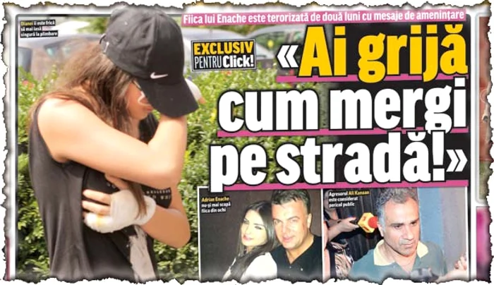 E monitorizată. Am prieteni foarte buni în cadrul serviciilor speciale. În caz de ceva, vreodată, Diana are un număr şi va suna… Eu am spus că el e un om slab din moment ce a încercat să-şi pună puterile cu o adolescentă, să sară cu briceagul şi să încerce să o violeze. Noroc că Diana e sportivă, dacă era altcineva în locul ei nu ştiu ce făcea… Oricum, el şi-a distrus viaţa. Nu mai are nici soţia şi nici fetele alături de el”, ne- a declarat Adrian Enache.Fata interpretului a fost înjunghiată în urmă cu patru ani de Ali Kanaan şi a avut nevoie, o bună perioadă de timp, de consiliere psihologică pentru a depăşi această traumă pe care a suferit-o la vârsta de 17 ani. Ea l-a dat în judecată pe agresor şi firma la care era angajat, iar instanţa i-a dat câştig de cauză. Bărbatul a fost condamnat la 5 ani de închisoare şi la plata a 50.000 de euro drept daune.