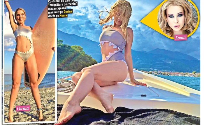 Două soliste minione şi sexy se laudă cu acelaşi costum de baie, cel cu muşcătura de rechin, care pe diverse site-uri se găseste la preţul de 100 de dolari. Este vorba despre Corina (36 de ani) şi Xonia (26 de ani).