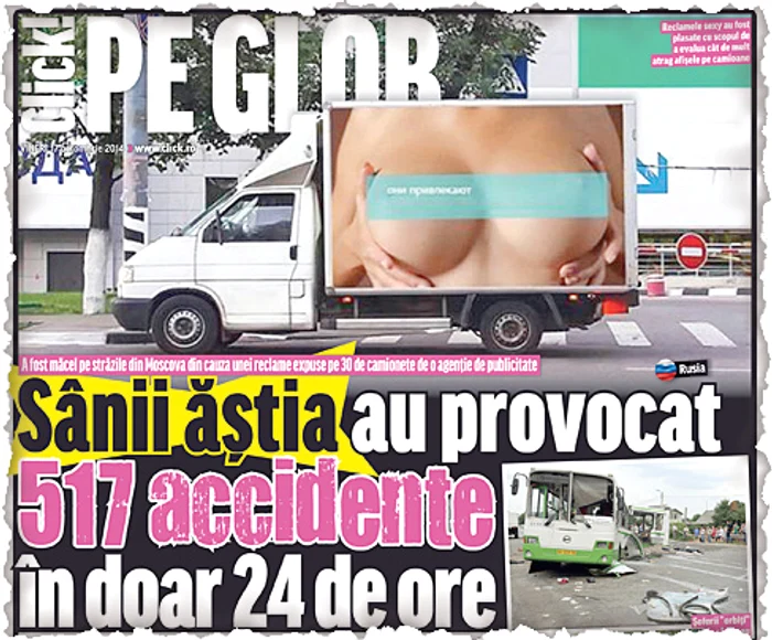 Anul trecut, agenţia rusă de publicitate Sarafan a vrut să-i convingă pe concetăţeni asupra eficienţei reclamelor plasate pe camioane. Prin urmare, au fost lipite pe 30 de camionete, care au pornit la plimbare pe străzile Moscovei, afişe provocatoare, în care apăreau nişte sâni goi foarte apetisanţi. Rezultatul a fost unul catastrofal, iar agenţia a fost bună de plată: în numai 24 de ore, poliţiştii au constatat că reclamele cu sâni au provocat peste 517 accidente!