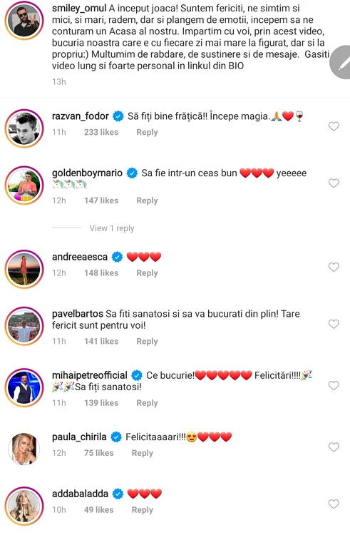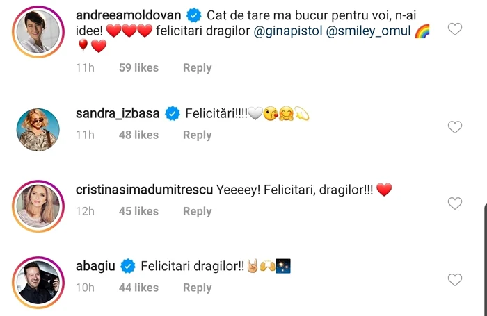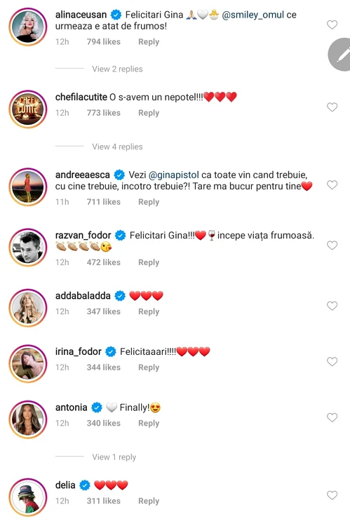 Solista Antonia a exclamat pe Instagram: "Finally" (În sfârșit!), Delia le-a trimis 3 inimi, Pavel Bartoș le-a mărturisit că este tare fericit pentru fericirea lor, iar proaspăta mămică Alina Ceușan i-a asigurat că ceea ce urmează este extrem de frumos."Să fiți sănătoși, începe magia", le-a urat și Răzvan Fodor.