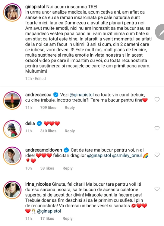Și pe Instagram, și pe Facebook, a plouat cu urări, nu doar pe YouTube, iar mesajele vedetelor au ieșit în evidență. Andreea Esca i-a scris Ginei cu toată dragostea: "Vezi, Gina Pistol, că toate vin când trebuie, cu cine trebuie, încotro trebuie?! Tare mă bucur pentru tine".