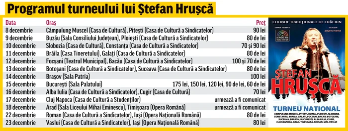 Şi-a dezamăgit fanii, anul trecut, când şi-a luat o pauză şi a decis să-şi petreacă Sărbătorile în Canada, la Toronto, acolo unde s-a stabilit în anul 1991. Ca să se revanşeze, anul acesta, în preajma Crăciunului, Ştefan Hruşcă (56 de ani) şi-a programat un adevărat maraton de cântări, în toată ţara. Oamenii din 23 de oraşe vor fi colindaţi cu celebrele-i piese “Trei păstori”, “Sfântă-i seara de Crăciun”, “Afară ninge liniştit”, dar şi nemuritorul “Leru-i, da leru-i ler”. „Mergeţi şi colindaţi neamurile, măcar părinţii. Este cel mai frumos obicei românesc creştinesc”, îi îndeamnă Ştefan Hruşcă pe cei ce vin la concertele sale. Efortul artistului va fi răsplătit pe măsură, iar după un calcul simplu, la finalul turneului organizat de Project Events, el îşi va umple “desaga”, nu cu mere şi nuci, ci cu peste 300.000 de euro. El are un tarif pe măsura valorii sale, cuprins între 10.000 şi 12.000 de euro, pentru două ore de cântat live. Spectacolul care îi aduce însă cei mai mulţi bani este cel din 15 decembrie, de la Sala Palatului din Capitală, care are o capacitate de 4.000 de locuri. Aici, preţurile biletelor variază între 60 şi 175 lei. În ţară, preţurile sunt ceva mai mici şi se situează în jurul sumei de 80 de lei. Turneul de colinde se va încheia pe 23 decembrie, când solistul va cânta la Vaslui şi la Iaşi.
