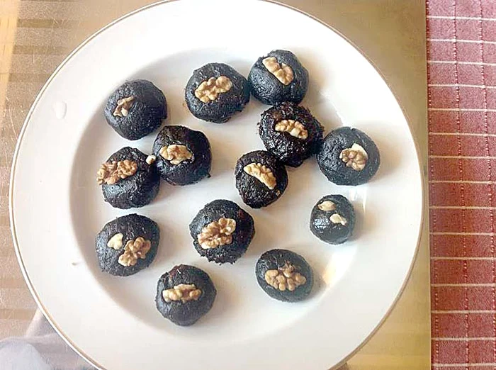Ingrediente: o cană de curmale înmuiate în apă timp de o oră, 4 linguri ulei de cocos şi două linguri de cacao. Toate ingredientele se mixează în blender până rezultă o pastă din care se modelează biluţe, care se dau la frigider până se întăresc.