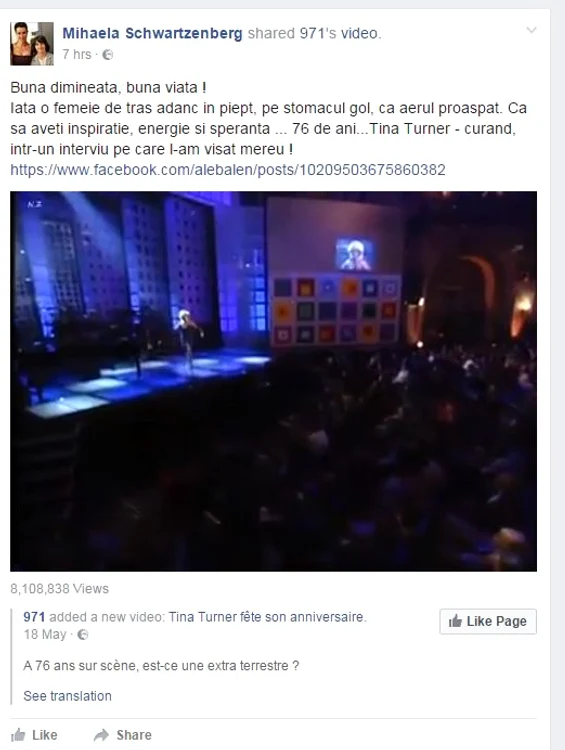 Cel puțin așa susține ea, potrivit un text redactat pe o rețea socială, însoțit de un videoclip cu Tina Turner. „Iată o femeie de tras adânc în piept, pe stomacul gol, ca aerul proaspăt. Ca să aveți inspirație, energie și speranță... 76 de ani... Tina Turner – curând, într-un interviu pe care l-am visat mereu”, a scris Mihaela Rădulescu pe profilul personal.