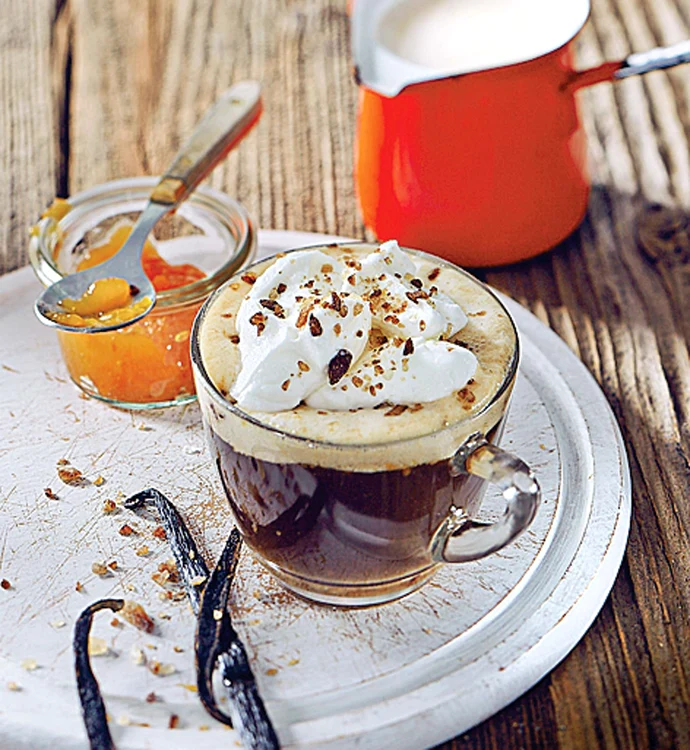 - Cafea cu vanilie. Ingrediente: 90 ml cafea fierbinte, 100 ml lapte, 70 g dulceaţă de portocale, jumătate de baton de vanilie, frişcă, zahăr brun. Preparare: torni laptele într-un ibric, adaugi dulceaţa şi încălzeşti uşor, amestecând încontinuu. Taie batonul de vanilie în jumătate, pune semințele în ibric și mai amestecă un pic. Pune cafeaua într-un pahar şi adaugă amestecul de lapte, strecurat. Apoi decorează cu frişcă, iar deasupra presară zahăr brun. Are gust grozav alături de fursecuri.